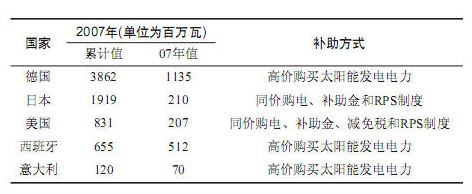 在太陽(yáng)能發(fā)電上領(lǐng)先的歐洲,主要采用電力公司以高于普通電力的價(jià)格購(gòu)買(mǎi)太陽(yáng)能發(fā)電系統(tǒng)所發(fā)的電力。而美國(guó)和日本則采用與普通電力相同的價(jià)格購(gòu)買(mǎi)太陽(yáng)能發(fā)電系統(tǒng)所發(fā)的電力。美、日還補(bǔ)助用戶購(gòu)置太陽(yáng)能發(fā)電系統(tǒng)。下表列出了幾個(gè)先進(jìn)國(guó)家的太陽(yáng)能發(fā)電的發(fā)電量(單位為百萬(wàn)瓦)和補(bǔ)助措施。
