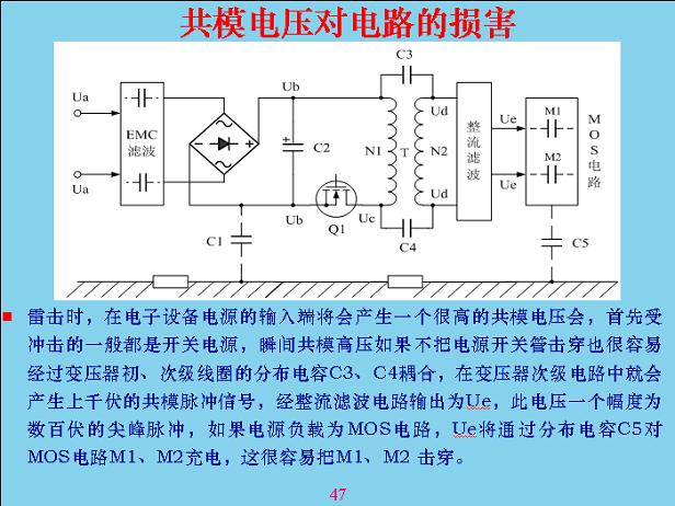 下面講一下共模電壓對電路的損害。其實(shí)共模電壓對開關(guān)電容前面的影響不是很大,最大是后面一點(diǎn),通過電壓器分布電路,以前的模式電路電壓用得很低,都是1v-5v左右,納米級容易擊穿,電容也相當(dāng)小。從里面串進(jìn)去的電壓經(jīng)過濾波不斷的吸收降下來,一般有上千伏,容易把后面的擊穿。在實(shí)踐過程中為了防雷,這幾個位置最好在上面布一個雷點(diǎn)電容,對防雷電擊穿很有效。共模電壓進(jìn)去以后瞬間擊穿,如果電子沒斷開,外面的電流會繼續(xù)延續(xù)下去把它燒掉,如果備一個電容上去,共模電容通過電容一下子把它吸收掉,讓幾個電容互相通電位,幾個模組不會那么容易擊穿。