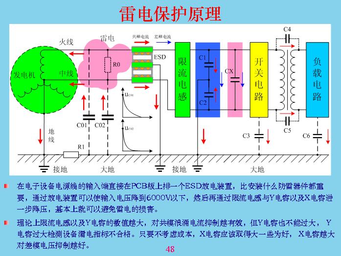 大家想想看,跟前面我們所說的,感應(yīng)雷這個東西沒有一個標(biāo)準(zhǔn)的概念說什么叫做感應(yīng)雷。只要打雷的話,外面打雷,窗戶上面的金屬,如果夜間都可以看到放電產(chǎn)生火花,這就是通過電磁感應(yīng)產(chǎn)生的位移電流原理。從原理上來說,三相四線或三相五線,發(fā)電機(jī)有中線接地,設(shè)備使用者的外殼接地是最有效的避雷方法,但現(xiàn)在很多設(shè)備都不接地,沒有辦法接,只有很貴重的進(jìn)口設(shè)備用三相電源,中間那一條地線,地線不是中線,大家要搞清楚。中線雖然是接地的,但在這里不能當(dāng)成地線,地線一定是自己大樓本身的地,而且要量好接地的地線。因?yàn)榈鼐€接進(jìn)去以后,大樓對外面的電磁層進(jìn)行屏蔽了,大樓相對來說也是導(dǎo)電的,就算不導(dǎo)電,現(xiàn)在國家都有安全要求,大樓超過多少層都要加上避雷針,就是防雷的。如果不能接地,你就要考慮充放電的問題。前面最好的共模電容我覺得還是要,我認(rèn)為這個共模電容最好連接上,不能接大地,要接在外殼上,接到外殼上有什么好處?共模電壓一進(jìn)來,雖然電流沒有通過地放電回路,把電壓舉高起來了,與外面輸入電壓是一樣的,外殼電壓取的一樣,起到了屏蔽作用。如果這個接地的話會更加安全,但是地線要足夠粗,回路也足夠,因?yàn)榉烹姷碾娏骱艽螅苋菀谉簟_@幾個東西是經(jīng)過很多年的試驗(yàn),8是很成熟的東西,不管做共模還是防雷都要做上,如果連機(jī)殼都沒有,只是塑料殼,也要考慮這根線接到什么位置最好?是接到里面面積最大的地方,就是公共地面積最大的地方,讓電位舉起來,其他電位差不會產(chǎn)生很大的電容回路。主要是考慮充放電回路,電流越小越好,兩個電位差越小越好。