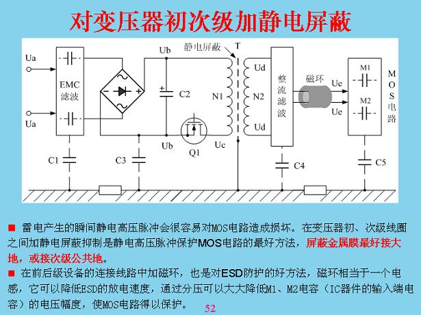 對于一些比較貴重的儀器、設(shè)備,在開關(guān)電容電壓器這里最好做靜電比例,在初次級線圈中間做一個鋁箔片都可以,包一層,這層不能短路,短路的話變壓器就會燒掉,包在外面可以短路,包在里面不能短路,包在外面吸收漏電電感,包在里面的主回路里面會短路,然后把它進(jìn)行接地,這相當(dāng)于可以隔離掉。這個有一個教訓(xùn),前段時間康佳臺灣裝LCD屏測試,打了一個隔離變壓器,后面就是接測試儀表,每個月都有一臺、兩臺測試儀表損壞,查不出原因,最后讓他們把隔離變壓器的中間屏蔽才好。屏蔽以后,進(jìn)一步有機(jī)會的話,在接頭有連接的地方加一個磁環(huán),讓共模電壓將磁環(huán)速度放慢,緩沖一下,讓瞬間能量降低,瞬間能量緩慢一點(diǎn),慢慢的過,損傷就會少很多。所有電路都可以把它看成一個分布電流,只要某地方電壓電位在改變,對后面都會產(chǎn)生充放電,從這上面理解就知道了,如果哪個地方構(gòu)成回路,如果有一個高電壓進(jìn)來一直傳導(dǎo)到后面,最后充電,充電可以理解成分布電容,如果沒有這個也有一個分布電容在里面,把分布電容放在這里,就比較形象地。就像以前的絕緣長效濾管一樣,手一摸沒有造成回路也壞掉了,絕緣的濾管很容易壞,一從里面拿出來,手一摸就壞掉,一個身上面帶正電,或者你作為天線有感應(yīng)電壓,感應(yīng)一下來回充放電就壞掉了。