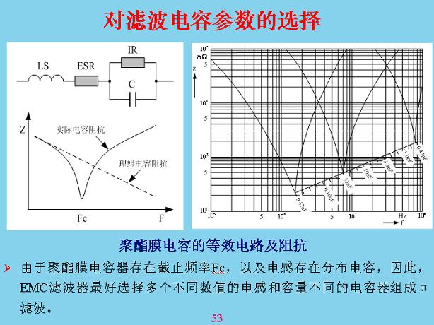 對于濾波電容,大家注意前面的EMC濾波,這個電容不是理想電容,里面有一個電感,還有漏電電阻,里面有串聯(lián)電阻,電感和電容有沒有產(chǎn)生串聯(lián)諧振?曲線是這樣一條斜線,串聯(lián)諧振相當(dāng)于把信號短路掉了,信號短路的阻礙很大,這里面有一個最佳值,然后成為感線,進(jìn)行EMC電路設(shè)計(jì)的時候最好用不同的電容進(jìn)行配模,這是0.4的曲線,33nF并聯(lián)就可以保證在上面不是好的,單獨(dú)一個電容后面覆蓋不到,以后有機(jī)會我講這些元器件,你們在大學(xué)里面學(xué)的是符號,對電阻電容基本是不懂的,還有電組電容這方面的問題最多,還有電容,電容來回極化的時候,速度跟不上外面的變化,會損耗相當(dāng)大,會燒壞,特別是脈壓電容,很多人認(rèn)為體積越小越好,但沒有考慮在開關(guān)上容易出現(xiàn)問題。