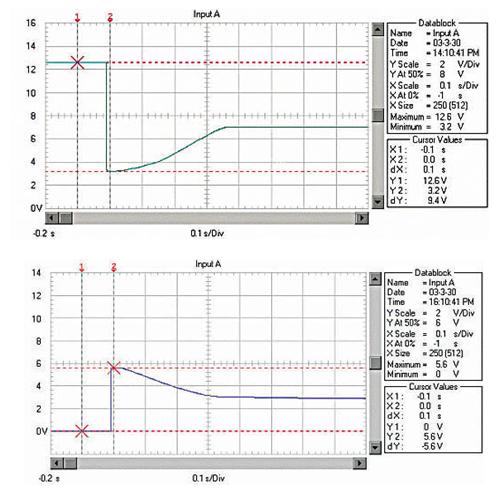 由于RM、RB、RL均非常低,啟動電流非常大。例如用12V、45Ah的蓄電池啟動安裝1.9升柴油機的汽車,蓄電池的電壓在啟動瞬間由12.6V降到約3.6V!啟動過程的蓄電池電壓波形如圖1;啟動瞬時的電流達550A,約為蓄電池的12C的放電率!啟動過程的蓄電池電流波形如圖2,(電流傳感器的電流/電壓變換比率:100A/V)。盡管車用蓄電池是啟動專用蓄電池,可以高倍率放電,但在圖1中可以看出,10倍以上的高倍率放電時的蓄電池性能變得很差,而且,如此高倍率放電對蓄電池的損傷也是非常明顯的。啟動過程的電壓劇烈變化也是極強的電磁干擾,可以造成電氣設備的“掉電”,迫使電氣設備在發電機啟動過程結束后重新上電,計算機在這個過程中非常容易死機。因此,無論從改善汽車電氣設備的電磁環境還是改善汽車的啟動性能和蓄電池的性能、延長使用壽命來考慮,改善汽車電源在啟動過程的性能是必要的。