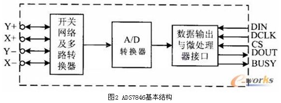 觸摸屏控制器有多種,主要的功能均是在微處理器的控制下向觸摸屏的兩個方向分時施加電壓,并將相應的電壓信號傳送給自身A/D轉換器,在微處理器SPI口提供的同步時鐘作用下將數(shù)字信號讀入微處理器。控制器ADS7846基本結構如圖2所示。