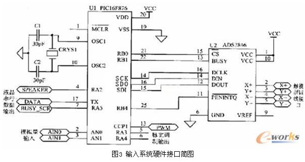 根據ADS7846與微控制器進行數(shù)據交換的接口特征,選用PIC16F876的SPI口。SPI口包括三個信號:SDO(串行數(shù)據輸出),SDI(串行數(shù)據輸入),SCK(串行同步時鐘)。硬件連接關系見圖3。
