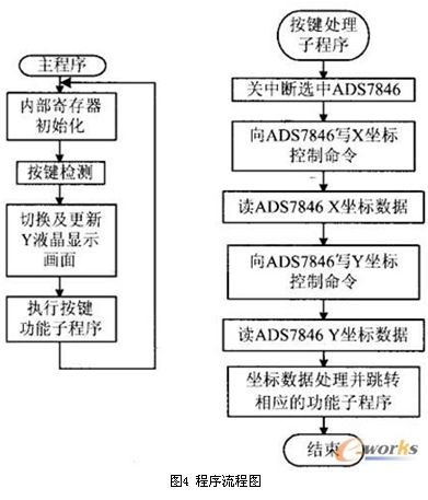 按照以上設計思想設計了應用軟件,圖4為主程序與觸摸屏輸入檢測部分的程序流程圖。其中,坐標數(shù)據處理通常采用查表的方法,將用戶命令的坐標形成數(shù)據表,利用獲得的坐標信息進行變換快速查表,從而提高軟件的運行速度。