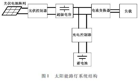 使用超級電容的太陽能LED路燈系統由光伏電池陣列、光伏控制器、超級電容、充電控制器、蓄電池、電流變換器、LED負載組成,連接結構如圖1所示。超級電容跨接在直流母線和地線之間,用于保持直流母線的電壓,并緩沖光伏電池提供的過大能量,在適當的時候放電以滿足蓄電池的充電需要和負載的供電需要。