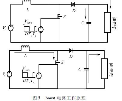 boost工作電路如圖5所示,根據電感L伏秒平衡和電容C充放電能量守恒有: