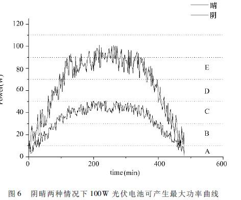 若直接采用光伏電池對蓄電池充電,則當光照較弱時,為了追蹤最大功率,在存在其他干擾因素的同時其輸出電壓會不穩定,導致光伏電池在充電時難以保持在Vzmin上,最后導致系統在該光照范圍內不能對蓄電池正常充電。如圖6中兩曲線分別為晴、陰兩種情況下100W光伏電池可產生的最大功率曲線;陰天的時候,光伏電池在最大功率跟蹤情況下,輸出功率在較低功率B、C區間內抖動,造成對蓄電池充電不可控。本文通過采用超級電容,把這部分不穩定的輸出能量蓄積起來,再到滿足一定的電壓條件時,通過升壓電路把超級電容中的能量釋放到蓄電池。這種采用超級電容的方式可以提高在弱太陽光照下的發電效率。