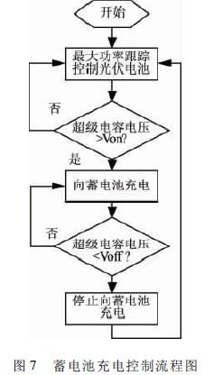 圖7為蓄電池充電控制策略。該策略在低光照情況下采用超級電容電壓的滯環比較控制策略,以超級電容兩端電壓作為反饋采樣信號。若超級電容兩端電壓低于設定下限值Voff,則停止向蓄電池充電,光伏控制器采用最大功率跟蹤對超級電容充電;當超級電容電壓充到足夠大為Von時(Von>Voff),以蓄電池的三段式10小時充電法向蓄電池充電;若此時持續低光照,則當超級電容電壓重新下降到下限值Voff時,再次停止向蓄電池充電,如此循環;在足夠光照情況下,當超級電容的電壓超過Von時,系統對蓄電池以三段式10小時充電法充電,同時超級電容電壓也會繼續上升,這時控制器保持超級電容的電壓值不超過新的上限值Vmax。