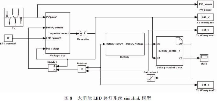 根據以上數據在仿真模型中建立simulink/matlab模型,模型按照圖1所示的系統結構建立,采用帶有最大功率跟蹤的光伏電池控制器,把光伏電池上的電能傳輸到直接并聯超級電容的直流母線上。同時電能通過蓄電池充放電控制器給蓄電池充電。如圖8所示,該系統的simulink模型主要有PV模塊、LED模塊、直流母線模塊、蓄電池模塊、超級電容積分模塊、蓄電池充電控制器模塊。