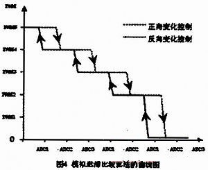 亮度感應(yīng)自動(dòng)控制的模擬遲滯比較算法將PWM的背光控制分成五段,四個(gè)模擬遲滯比較算法控制。每個(gè)模擬遲滯比較器有兩個(gè)閾值A(chǔ)DC值,分別稱為正向閾值A(chǔ)DC和負(fù)向閾值A(chǔ)DC。在環(huán)境亮度輸入信號(hào)從低電平(暗)上升到高電平(亮)的過(guò)程中使PWM電路狀態(tài)發(fā)生變化的輸入ADC稱為正向閾值A(chǔ)DC,在輸入信號(hào)從高電平(亮)下降到低電平(暗)的過(guò)程中使PWM電路狀態(tài)發(fā)生變化的輸入ADC稱為負(fù)向閾值A(chǔ)DC。例如ADC2是正向閾值A(chǔ)DC,ADC1是負(fù)向閾值A(chǔ)DC,在環(huán)境亮度輸入信號(hào)從ADCI低電平(暗)上升到ADC2高電平(亮)的過(guò)程中,使PWM狀態(tài)由PWN5轉(zhuǎn)變?yōu)镻WM4;在環(huán)境亮度輸入信號(hào)從ADC2高電平(亮)下降到ADC1低電平(暗)的過(guò)程中,使PWM狀態(tài)由PWN4轉(zhuǎn)變?yōu)镻WM5。這樣設(shè)計(jì)成阻止環(huán)境亮度輸入信號(hào)出現(xiàn)微小變化(低于某一閾值A(chǔ)DC)而引起輸出PWM的改變,確保穩(wěn)定的液晶面板背光控制。如圖4亮度感應(yīng)自動(dòng)控制的模擬遲滯比較算法的曲線圖所示。