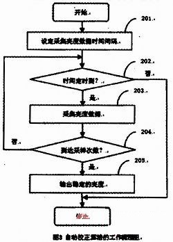亮度感應(yīng)自動(dòng)控制的自動(dòng)校正算法的步驟:首先設(shè)定采集亮度數(shù)據(jù)的時(shí)間間隔以及設(shè)定采樣次數(shù);當(dāng)時(shí)間間隔定時(shí)到時(shí),讀取光感應(yīng)器亮度的數(shù)據(jù);當(dāng)采樣次數(shù)到達(dá)預(yù)設(shè)次數(shù)后,輸出穩(wěn)定的亮度;再由CPU輸出穩(wěn)定的PWM,去控制液晶面板的背光。設(shè)定采集亮度數(shù)據(jù)時(shí)間間隔201是初始化每次采集光感應(yīng)器亮度的時(shí)間。時(shí)間定時(shí)到202是達(dá)到可以去采集光感應(yīng)器亮度的時(shí)間。采集亮度數(shù)據(jù)203是CPU讀取光感應(yīng)器亮度數(shù)據(jù)通過(guò)ADC的數(shù)字信號(hào)的數(shù)值。到達(dá)采樣次數(shù)204是到達(dá)采集亮度數(shù)據(jù)都一樣的次數(shù),表示環(huán)境亮度已經(jīng)穩(wěn)定,不再變化。輸出穩(wěn)定的亮度205是CPU輸出穩(wěn)定的PWM去控制液晶面板的背光。如圖3亮度感應(yīng)自動(dòng)控制的自動(dòng)校正算法的工作流程所示。