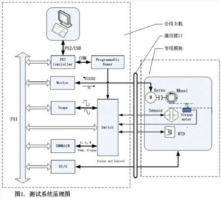 目前,汽車傳感器沒有一個統一的行業標準,基本是按照使用者的要求定制。譬如目標輪及其轉速、空氣氣隙和傳感器的安裝尺寸各不相同,即使是傳感器裝配到同一種車型上,也會隨著安裝位置的不同而存在差異。但是,同一臺設備不可能滿足全部傳感器的測試要求,由此引入模塊化的設計思想,即系統中相同的部分,如測試儀器、測試軟件、氣動控制系統、主電路系統,作為公用資源(這里稱為“主機”);對系統中要求隨著傳感器變化的部分,如目標輪及馬達、夾具及專用電路,被看成模塊。主機和模塊之間采用快插的方式完成電氣連接且為標準化接口,可進行后續擴展。當測試不同傳感器時,選用不同的測試模塊連接到主機上即可。