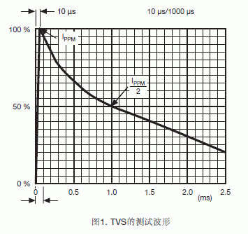 TVS的額定功率是在一定測試或應用條件下吸收浪涌的能力。10μs/1000μs脈沖波形的工業(yè)標準測試條件(Bellcore 1089標準)如圖1所示。這個測試條件不同于8μs/20μs脈沖波形的TVS瞬態(tài)電壓吸收能力測試條件,如圖2所示。