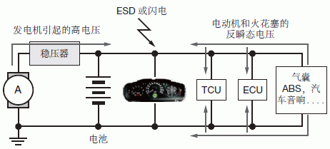 電子控制單元、傳感器和信息娛樂系統(tǒng)等汽車電子設備連接在一根電源線上(圖4)。這些電子產(chǎn)品的電源是電池和交流發(fā)電機,這兩種電源的輸出電壓都不穩(wěn)定,容易受溫度、工作狀態(tài)和其他條件影響。此外,使用燃油噴射系統(tǒng)、閥、電機、電氣和水解控制器等電磁線圈負載的汽車系統(tǒng),會把ESD、尖峰噪聲和其他類型的瞬態(tài)和浪涌電壓引入到電源和信號線上。