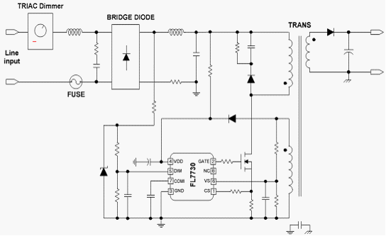 為幫助設(shè)計(jì)人員解決這些問(wèn)題,飛兆半導(dǎo)體公司開(kāi)發(fā)出帶有功率因數(shù)校正(PFC)、TRIAC和模擬調(diào)光能力的FL7730單級(jí)初級(jí)端調(diào)節(jié)(PSR)控制器。該款驅(qū)動(dòng)器采用獨(dú)特的模擬感測(cè)技術(shù),可在從0至100%光輸出的整個(gè)范圍內(nèi)實(shí)現(xiàn)無(wú)閃爍的TRIAC調(diào)光控制。FL7730調(diào)光電壓形成內(nèi)部CS補(bǔ)償以降低調(diào)整輸出電流,調(diào)光能兼容市場(chǎng)80%以上調(diào)光器產(chǎn)品。