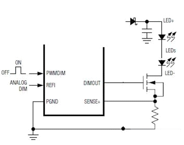 然后用一個(gè)PWM信號(hào)加到MOS管的柵極,以快速地開(kāi)關(guān)這串LED。從而實(shí)現(xiàn)調(diào)光。也有不少恒流芯片本身就帶一個(gè)PWM的接口,可以直接接受PWM信號(hào),再輸出控制MOS開(kāi)關(guān)管。