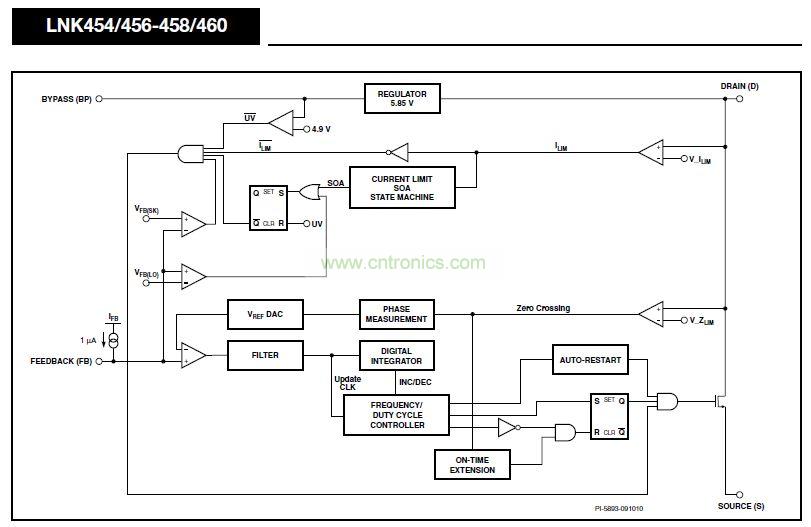 LinkSwitch-PL在一個器件上集成了一個高壓功率MOSFET開關(guān)及一個電源控制器。該IC器件提供單級功率因數(shù)校正和LED電流控制。LinkSwitch-PL控制器包括一個振蕩器、反饋(檢測及邏輯)電路、5.85 V穩(wěn)壓器、遲滯過熱保護、頻率抖動、逐周期限流、環(huán)路補償電路、自動重啟動、開關(guān)導通時間延長、功率因數(shù)以及恒流控制電路。