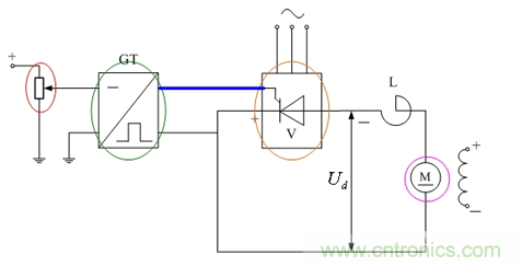 改變GT的輸入信號(圖2中的紅色圈顯現)大小,就可改變其輸出脈沖(圖2中的藍色線條顯現)的相位,不同相位的脈沖輸入整流器V,可以使整流器的輸出電壓Ud的大小發(fā)生變化,進而改變電動機M的轉速。