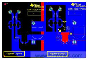 圖4和圖5之間噪聲結果的不同主要是由于PCB布線差異所致,如圖6所示。圖5的布線中(圖6的右側),大面積覆銅(GND)包圍著DM濾波器,并和Vin走線形成了一些寄生電容。 這些寄生電容為高頻信號旁路濾波器提供了有效的低阻抗路徑。 因此,為了最大限度地提高濾波器的性能,需要移除濾波器周圍所有的覆銅,如圖6左側的布線。
