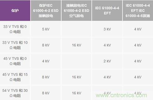 表1. 測試結果(未在0 Ω電阻與33 V TVS及45 V TVS組合條件下進行IEC空氣放電測試)