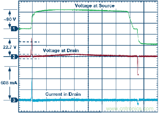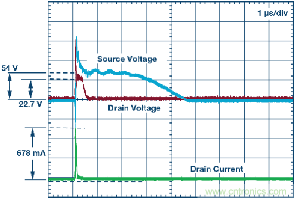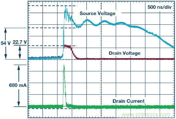 圖7. 16 kV空氣放電事件期間的漏極電壓和漏極輸出電流。
