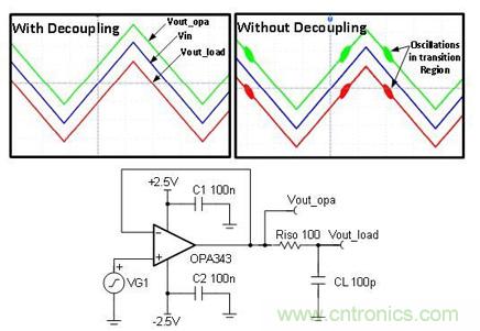 圖 1 為帶去耦電容器和不帶去耦電容器(C1 和C2)情況下用于驅(qū)動(dòng) R-C 負(fù)載的緩沖電路。我們注意到,在不使用去耦電容器的情況下,電路的輸出信號(hào)包含高頻 (3.8MHz) 振蕩。對(duì)于沒有去耦電容器的放大器而言,通常會(huì)出現(xiàn)穩(wěn)定性低、瞬態(tài)響應(yīng)差、啟動(dòng)出現(xiàn)故障以及其它多種異常問題。