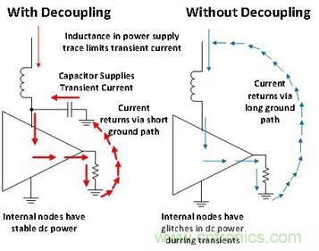 圖 2 闡述了為什么去耦非常重要。需要注意的是,電源線跡的電感將限制暫態(tài)電流。