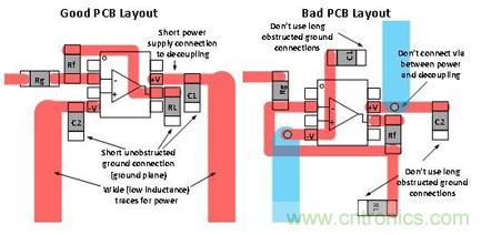 圖 3 將良好的去耦合板面布局與糟糕的布局進(jìn)行了對(duì)比。您應(yīng)始終嘗試著讓去耦合連接保持較短的距離,同時(shí)避免在去耦合路徑中出現(xiàn)通孔,原因是通孔會(huì)增加電感。大部分產(chǎn)品說明書都會(huì)給出去耦合電容器的推薦值。如果沒有給出,則可以使用 0.1uF。