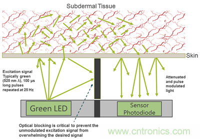圖1展示了測量心率信號的基本方法,它依賴于用光學方法從人體組織上提取的心率壓力波。圖1說明了光進入皮膚后傳輸的途徑:由心率壓力波引起的毛細血管舒張和收縮運動對由綠色LED注入人體組織的光信號進行了調制。接收到的信號因為通過了皮膚而被大大地衰減,它被一個光電管接收并送到電子子系統中去處理。源自脈搏的振幅調制信號被檢測(過濾掉運動噪聲)、分析和顯示。