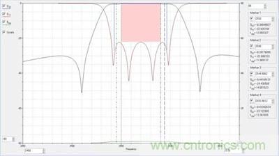 3.1 多模濾波器的設計,通帶電性能的評估,和單模的評估是一樣的,只是在Q值的評估中,多模的Q值是要高于單模的,這個可以根據本征模的仿真中觀察到。下圖為一個雙腔4模濾波器的原理評估仿真結果: