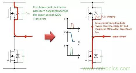 除了電阻損耗以外,開關(guān)損耗由兩種損耗機制決定:首先是存儲在續(xù)流二極管中的反向恢復(fù)電荷(Qrr),它導(dǎo)致激活的低邊開關(guān)晶體管導(dǎo)通出現(xiàn)電流峰值;其次是對阻塞高邊開關(guān)晶體管的輸出電容(COSS)進行再充電時所流動的充電電流峰值。