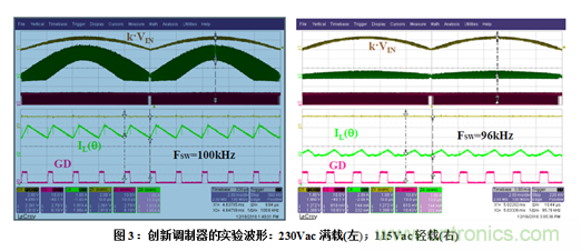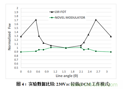 具體地講,圖3所示是開(kāi)關(guān)頻率在寬輸入電壓(230Vac-左和115Vac-右)范圍和所有負(fù)載條件中(CCM-左, DCM - 右)保持恒定。與標(biāo)準(zhǔn)LM-FOT方法相比,本文提出的創(chuàng)新調(diào)制器的性能大幅改進(jìn),特別是在高壓線DCM運(yùn)行模式更為明顯,如圖4所示。