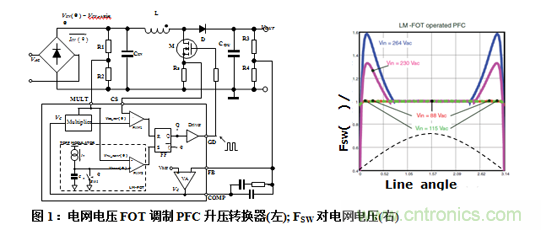 例如,用FOT方法控制CCM PFC前級(jí)升壓穩(wěn)壓器,導(dǎo)致開(kāi)關(guān)頻率隨電網(wǎng)電壓和負(fù)載條件而發(fā)生明顯變化[1]。按照實(shí)時(shí)電網(wǎng)電壓調(diào)制關(guān)斷時(shí)間,可以降低開(kāi)關(guān)頻率(TOFFKt Vin, pksinθ), 如圖1所示,只要升壓級(jí)是CCM模式,最終開(kāi)關(guān)頻率是恒定的[2],如圖1右圖所示。
