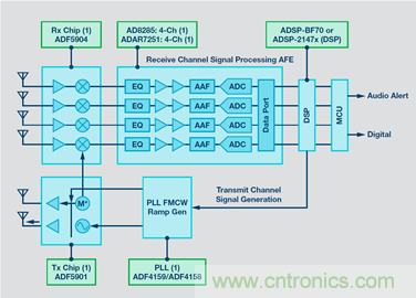 ADI公司負責24GHz芯片組的應用工程師Patrick Walsh在介紹此方案時指出,這是ADI最新的開發(fā)平臺——演示雷達,演示雷達是一款完整的天線到比特解決方案,擁有完整的ADI信號鏈。這個產品包括一個兩通道發(fā)送,四通道接收解決方案,提供執(zhí)行FM-CW調制的斜坡PLL,ADC可以將基帶信號轉換進入DSP,為我們提供完整的信號鏈。該演示雷達只需連接USB和電源,用戶就可以啟動運行,在幾分鐘之內收到雷達信號。