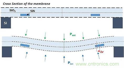 在制造該器件的過程中,創制了一個傳感膜。當膜彎曲時,波導的位置發生變化,從而引起光路延伸,導致該特定臂發生相移(圖2)。