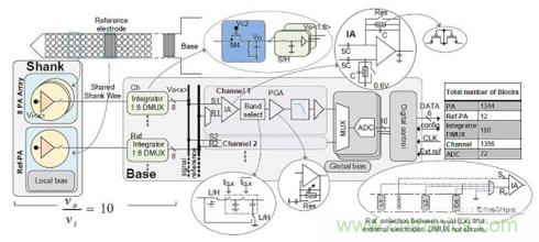 探針架構設計(圖5)中的信號流,通過一條共享柄線從8個多路復用PA陣列的輸出流向底座。然后,該信號進入探針底座中的積分器,積分器的輸出通過8個標記為Vo的采樣保持電路進行解復用。接下來,8個單獨的Vo中的每一個都進入自己的信道模塊,它們對信號進行放大和濾波,使得輸出僅有感興趣的頻帶。接下來,所有20個通道經過多路復用并由10位逐次逼近寄存器式(SAR)模數轉換器(ADC)進行數字化,并發送至為ADC和多路復用/多路解復用器(MUX/DEMUX)提供時鐘的數字控制模塊。在此,所有ADC的并行輸出經串行化后僅有6條數據線。