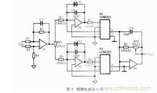 在實際檢測電路的某一采集信道中,如需對一組差動輸入信號進行檢測,可將電路接成如圖3所示的連接方式。圖中,通過放大器N1可將輸入的差動信號變為單邊信號后輸出。由于二極管V1和V2的作用,當輸入信號為正時,V2導通,V1截止,放大器N2呈開環狀態,光耦N5工作,N4關斷;而當輸入信號為負時,則正好相反。當HCNR201的第3、4端的光敏二極管受光后,其輸出信號將反饋到放大器的輸入端,以提高光耦的線性并減少溫漂。第5、6端輸出的信號經運放放大后輸出。電位器RP1的作用是調節運放輸入偏置電流的大小。電容C2、C3為反饋電容,可用于提高電路的穩定性,消除自激振蕩,濾除電路中的毛刺信號,降低電路的輸出噪聲,其容值可根據電路的頻率特性來選取。放大器N6的作用是把光耦輸出的電流信號轉變為電壓信號以供后級電路使用,并增強負載驅動能力,降低輸出阻抗。調整電阻RP2的值可以調整信道的增益。