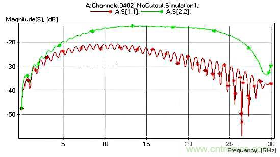 圖7圖8對(duì)比,在用ROGERS板材做隔層處理之后,相比未做隔層處理回波損耗下降到-30dB之內(nèi),大大降低了回波損耗,保證了信號(hào)傳輸?shù)耐暾?/div>