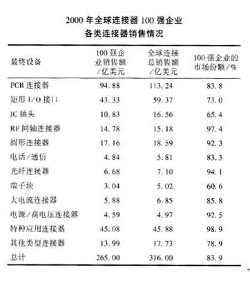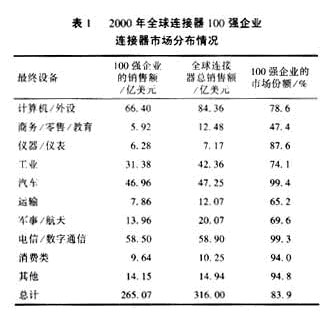 自2001年以來,受“9.11”恐怖事件、網絡通訊業泡沫破滅及美國經濟低迷的影響,世界連接器市場一度遭受重創,2001年的銷售額下降19.1%,但是,軍用連接器市場卻在平穩中微增。據Fleck的研究報告,軍事/航天用連接器2000年的銷售額為20.072億美元,2001年達到20.118億美元,增長0.2%。全球連接器100強企業占據了69.1%軍用連接器市場份額,如表1所示。各類軍用連接器也基本上由全球100強企業所壟斷,如表2所示。