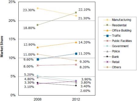 2007-2012年,住宅應用的市場份額預計將從18.8%升至22.1%。同期政府在安防方面的支出將會下降。但是,用于監(jiān)控交通與零售店的視頻監(jiān)視增長較快,將推動中國安防市場的增長。安防系統(tǒng)在制造業(yè)的滲透率較高,預計未來在該領域的增長將會放緩。