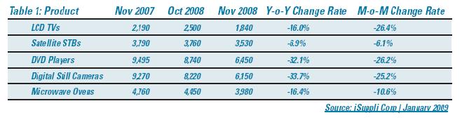 2008年11月,許多主要消費電子產品的出口量環比和同比雙雙下降,包括液晶電視、衛星機頂盒(STB)、DVD機、數碼相機和微波爐。數碼相機出口量的同比下降幅度最大,比2007年11月減少33.7%。液晶電視環比降幅最大,單位出貨量比10月下滑26.4%。