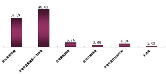 一個公司能否健康地發(fā)展,領(lǐng)導(dǎo)層的作用至關(guān)重要。常言道,滄海橫流方顯英雄本色,在經(jīng)濟(jì)牛市中,考驗的是企業(yè)決策人的遠(yuǎn)見和膽識,在經(jīng)濟(jì)熊市中,就更需要企業(yè)領(lǐng)導(dǎo)層的聰明才智。此次調(diào)查顯示,超過64.3%的電子工程師給了自己的企業(yè)領(lǐng)導(dǎo)層很正面的評價,從這個結(jié)果來看,我們的電子行業(yè)的工作和諧程度還是較高的!