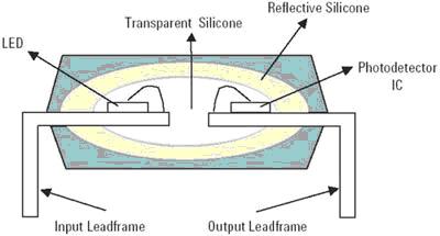 在平面工藝中,LED和IC位于與引線框和焊接線相同的平面中。然后使用一層透明的硅樹脂,以近似圓屋頂形覆蓋LED和IC。硅樹脂提供了光導(dǎo)能力。為防止光逸出,在透明硅樹脂上使用了另一層白漆。因此,來自LED的光會(huì)在圓屋頂內(nèi)部反射到IC上。最后,器件使用不透明的澆鑄化合物封裝。