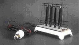 愛迪生發(fā)明的白熾燈把世界帶入了電氣時代,但墻壁插座并非與燈泡同時出現(xiàn)??紤]成本因素,當(dāng)電扇、電烤面包機、吸塵器、電吹風(fēng)出現(xiàn)時,它們?nèi)匀谎匾u了燈泡的供電方式——接到燈頭座上(圖1.1)。盡管HarveyHubbell在1904年發(fā)明了更方便的2芯插頭/座(圖1.2),但采用燈頭取電的方式一直沿用到20世紀20年代。