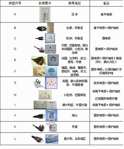 交流電墻壁插座的歷史不過80年,此間隨著用電量、用電經(jīng)驗與事故教訓(xùn)的增加,由于技術(shù)、安全性、經(jīng)濟性等因素,加之地理、歷史、政治等原因,世界各地在發(fā)展民用電器供電裝置時,并沒有采用美國最初的插座設(shè)計而形成了不同標準,使得墻壁插座形式多種多樣。美國商務(wù)部統(tǒng)計了全球常見電源插頭/座(表2.1)樣式,并以字母進行了分類。