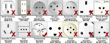 這些插頭/座大多彼此互不兼容,如果再把同一類型中耐壓、功率的差別計入在內(nèi),種類就更多了。這種情況顯然造成:即使電器設(shè)備供電電壓相同,也無法在不同地區(qū)使用。國際電工委員會(IEC)曾經(jīng)在1986年和1992年頒布了電源插頭/座的國際標準:針對250V電壓等級的IEC60906-1和針對125V電壓等級的IEC60906-2。其3芯插頭外觀(圖2.1)類似于表2.1中的J型,由于與全球范圍內(nèi)大多數(shù)插頭/座不兼容(圖2.2),推行受到很大阻力。