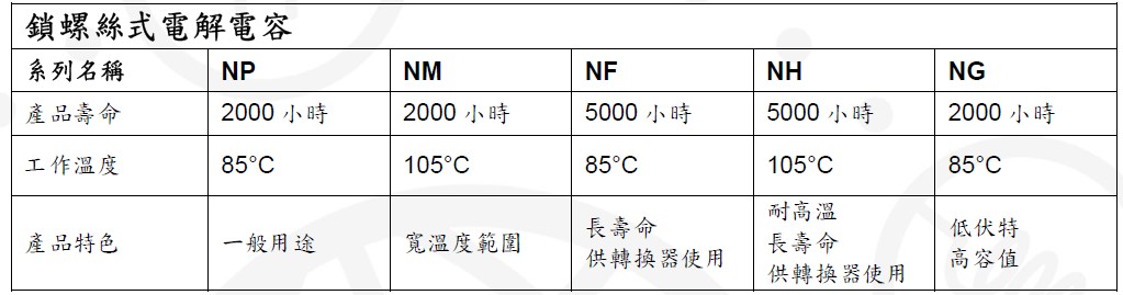 全新推出的工業(yè)級超長效鎖螺絲式電解電容系列包括NP、NM、NF、NH、NG 等五個系列,分別鎖定一般用途、寬溫度范圍、長效轉(zhuǎn)換器、高溫環(huán)境轉(zhuǎn)換器以及低電壓大容值等應用。工作溫度范圍涵蓋85°C 至105°C;使用壽命時效,則一舉提升至2000 到5000 小時。與其他同類型產(chǎn)品相比,具備難以匹敵的寬溫度范圍及長時效特性。