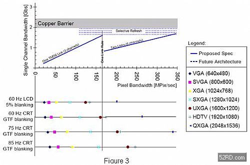 DVI是市場上第一個標(biāo)準(zhǔn)化的純數(shù)字視頻連接。與HDMI一樣,它對單或雙鏈路配置的需求取決于所選的顯示器解析度,以及顯示器類型和相應(yīng)的更新頻率。DVI端子在電腦應(yīng)用中仍然相當(dāng)普及,許多系統(tǒng)都具有DVI輸出以便實(shí)現(xiàn)至數(shù)字LCD 顯示器的直接數(shù)位連接。舉例說,一個更新頻率為60Hz的高解析度 LCD顯示器(1920x1080)可利用單鏈路DVI和約130MHz的時脈頻率連接。這可參考圖3 的DVI規(guī)格參考。