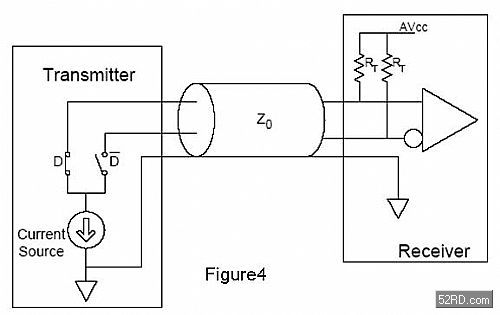 許多設(shè)計人員都很熟悉電壓驅(qū)動應(yīng)用,并因此很自然地設(shè)想導(dǎo)通阻抗是開關(guān)選擇中最重要的規(guī)格。這種設(shè)想出于在電壓源應(yīng)用中,導(dǎo)通阻抗往往會引起插損和信號衰減。但幸運(yùn)地,HDMI 和 DVI信號并沒有這個問題,因?yàn)樗鼈兪褂镁哂薪K端電阻的電流源來建立信號電平。圖4所示為如何建立TMDS信號的基本原理圖。